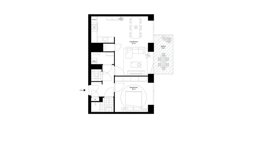 Dit 2-kamerappartement ligt op de 7e, 11e, 15e en 19e verdieping. Het appartement heeft een woonoppervlakte van ongeveer 57 m² en is ingedeeld met een living met halfopen hoekkeuken, balkon op het noordoosten, ruime slaapkamer, apart toilet en badkamer met wastafel en inloopdouche. Je hebt twee bergingen voor de wasmachine en wasdroger en de technische apparaten.