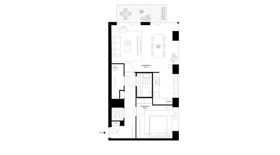 Dit 2-kamerappartement van ongeveer 62 m2 ligt op de 5e verdieping en heeft een terras van ongeveer 12 m2 op het noordwesten. Vanwege de hoekligging heeft dit appartement extra ramen wat zorgt voor een mooie lichtinval. Het appartement is ingedeeld met een royale living met halfopen hoekkeuken, ruime slaapkamer, apart toilet en badkamer met wastafel en inloopdouche. In de berging kun je de wasmachine en wasdroger plaatsen en staan de technische apparaten.