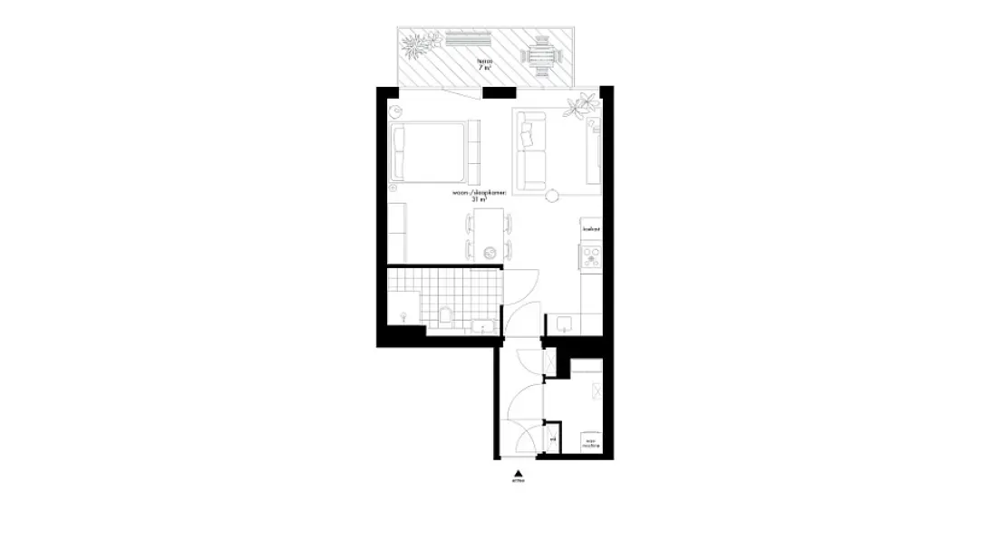 Deze studio ligt op de 5e, 9e, 13 en 17e verdieping en heeft een ruim terras op het noordwesten. Het appartement heeft een oppervlakte van ongeveer 46 m² en is ingedeeld met een living met open hoekkeuken en badkamer met toilet, wastafel en inloopdouche. In de berging heb je ruimte voor een wasmachine en staan de technische apparaten.