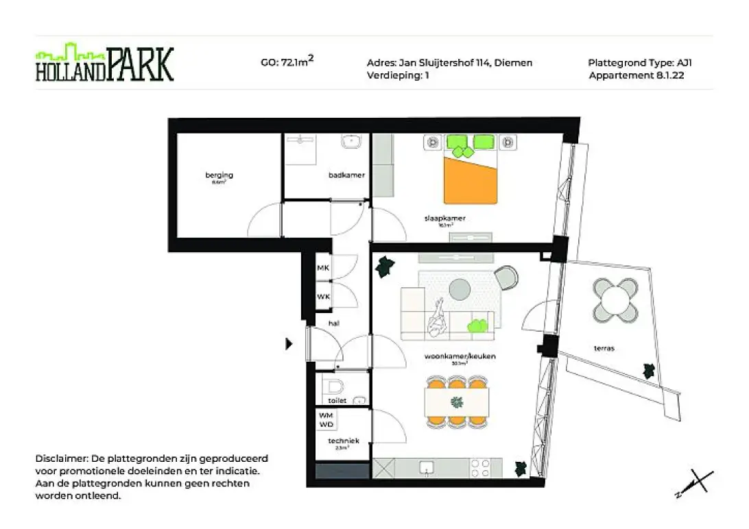 Dit comfortabele 2-kamer appartement biedt een ideale leefomgeving voor een single of een stel. De ruime woonkamer met open keuken vormt het hart van het appartement, perfect voor ontspanning en het ontvangen van gasten. De slaapkamer biedt voldoende ruimte voor een tweepersoonsbed en kastruimte. Een moderne badkamer, apart toilet en een handige berging maken dit appartement compleet. In sommige gevallen is er een extra onbenoemde ruimte aanwezig, flexibel te gebruiken als werk- of hobbyruimte. Voor een gedetailleerd overzicht van de indeling en afmetingen van de verschillende ruimtes, zie de plattegrond.