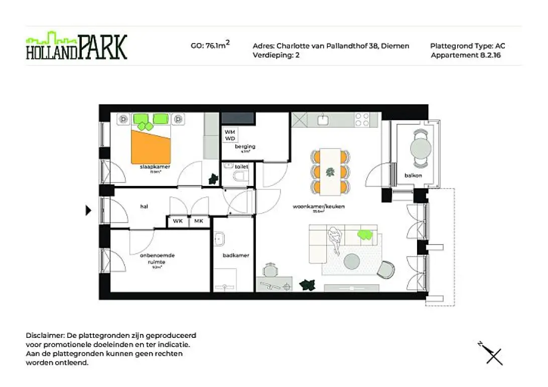 Dit comfortabele 2-kamer appartement biedt een ideale leefomgeving voor een single of een stel. De ruime woonkamer met open keuken vormt het hart van het appartement, perfect voor ontspanning en het ontvangen van gasten. De slaapkamer biedt voldoende ruimte voor een tweepersoonsbed en kastruimte. Een moderne badkamer, apart toilet en een handige berging maken dit appartement compleet. In sommige gevallen is er een extra onbenoemde ruimte aanwezig, flexibel te gebruiken als werk- of hobbyruimte. Voor een gedetailleerd overzicht van de indeling en afmetingen van de verschillende ruimtes, zie de plattegrond.