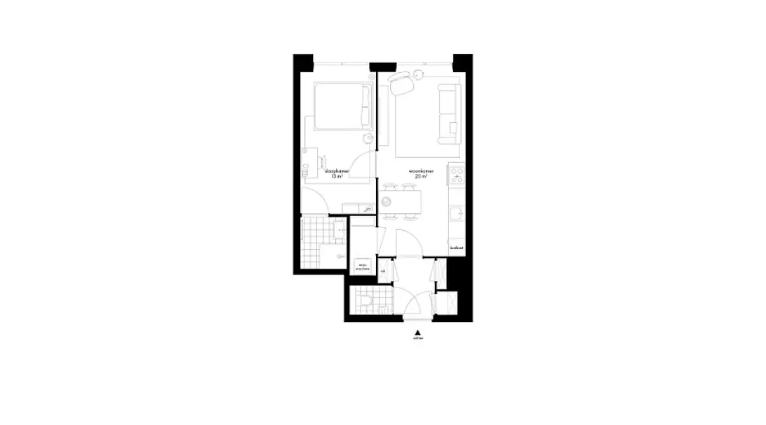 Dit compacte 2-kamerappartement ligt op de mezzanine en 1e tot en met de 10e verdieping. Het appartement heeft een woonoppervlakte van ongeveer 44 m² en is praktisch ingedeeld met een living met open keuken, ruime slaapkamer met en suite badkamer en apart toilet. De berging, met de aansluitingen voor de wasmachine en wasdroger, ligt tegenover de keuken.