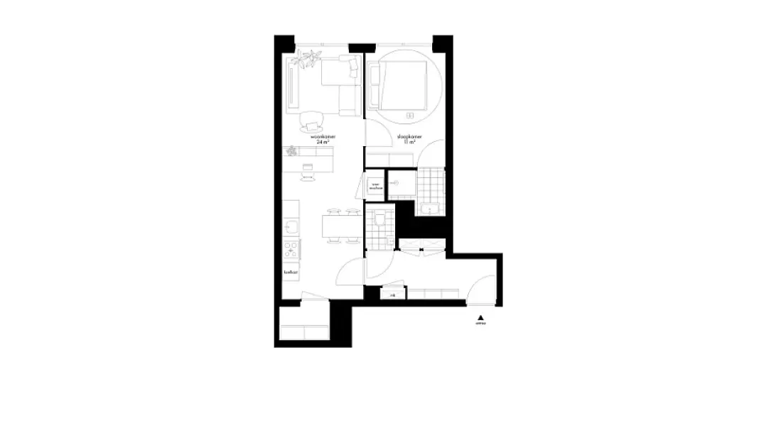 Dit 2-kamerappartement ligt op de mezzanine en 1e, 2e en 3e verdieping. Het appartement heeft een woonoppervlakte van ongeveer 48 m² en is praktisch ingedeeld met een ruime living met open keuken, een slaapkamer met en suite badkamer en separaat toilet. Vanwege de hoekligging heeft dit appartement extra ramen in de living en keuken, wat zorgt voor een mooie lichtinval. De bergkast, met de aansluitingen voor de wasmachine en wasdroger, is bereikbaar vanuit de living. En naast de keuken heb je nog een extra kast.