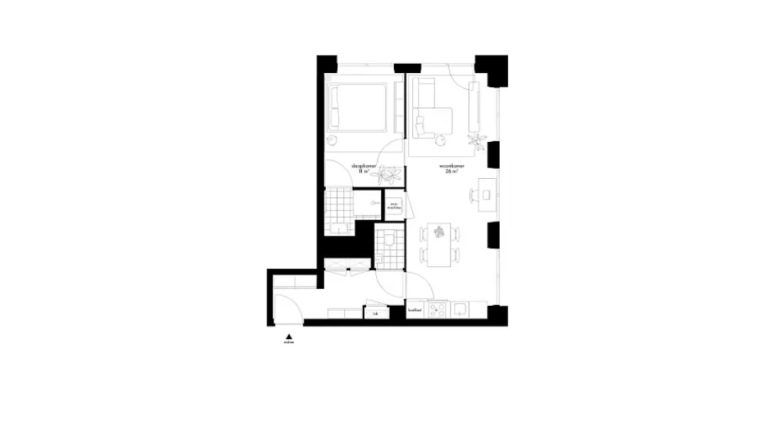 Dit 2-kamerappartement ligt op de begane grond. Het appartement heeft een woonoppervlakte van ongeveer 50 m² en is praktisch ingedeeld met een hal met garderobenis en separaat toilet, ruime living met open keuken en een slaapkamer met en suite badkamer. Vanwege de hoekligging heeft dit appartement extra ramen in de living en keuken, wat zorgt voor een mooie lichtinval. De bergkast, met de aansluitingen voor de wasmachine en wasdroger, is bereikbaar vanuit de living.