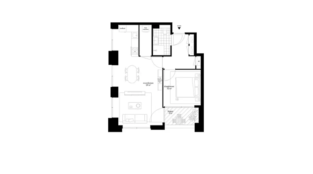 Dit 2-kamerappartement ligt op de 1e, 2e en 3e verdieping. Het appartement heeft een woonoppervlakte van ongeveer 55 m² en is ingedeeld met een ruime living met open hoekkeuken, slaapkamer en badkamer met toilet, wastafel en inloopdouche. De loggia biedt een fijne plek buiten. Vanwege de hoekligging heeft dit appartement extra ramen in de living, wat zorgt voor een mooie lichtinval vanuit het westen. In de berging c.q. bijkeuken kun je de wasmachine en wasdroger op elkaar plaatsen.