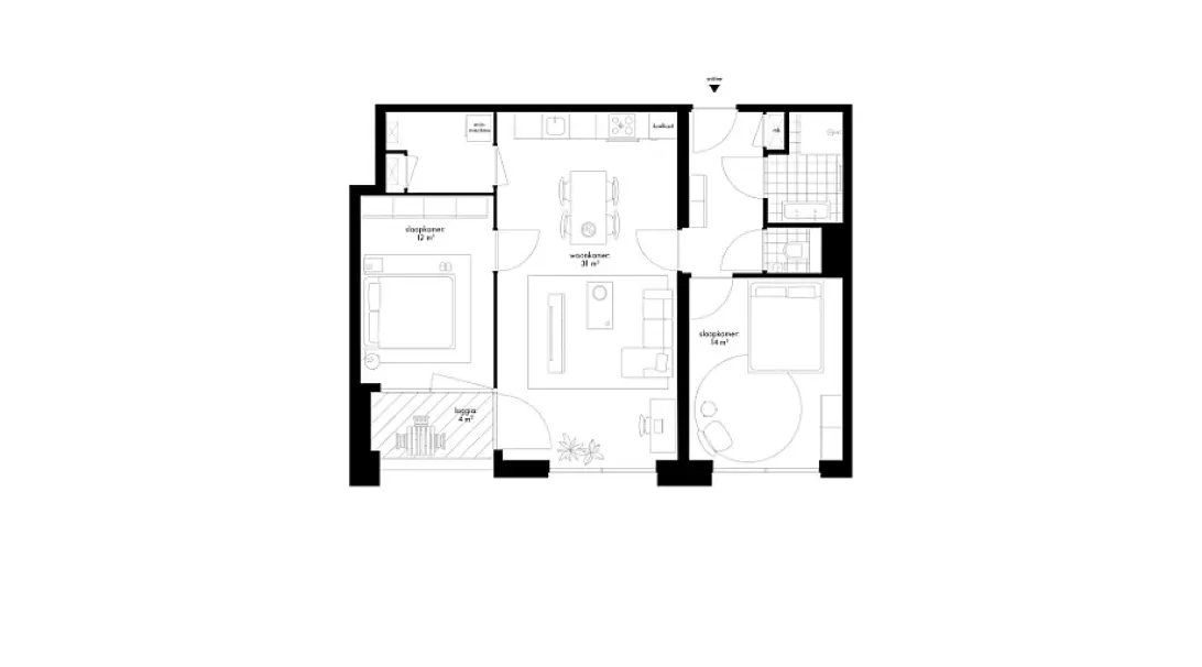 Dit ruime 3-kamerappartement ligt op de 1e, 2e en 3e verdieping. Het appartement heeft een woonoppervlakte van ongeveer 75 m² en is ingedeeld met een ruime living met open keuken, twee slaapkamers, separaat toilet en badkamer met brede wastafel en inloopdouche. De loggia biedt een fijne plek buiten. In de berging c.q. bijkeuken kun je spullen opbergen en is plaats voor een wasmachine en wasdroger.