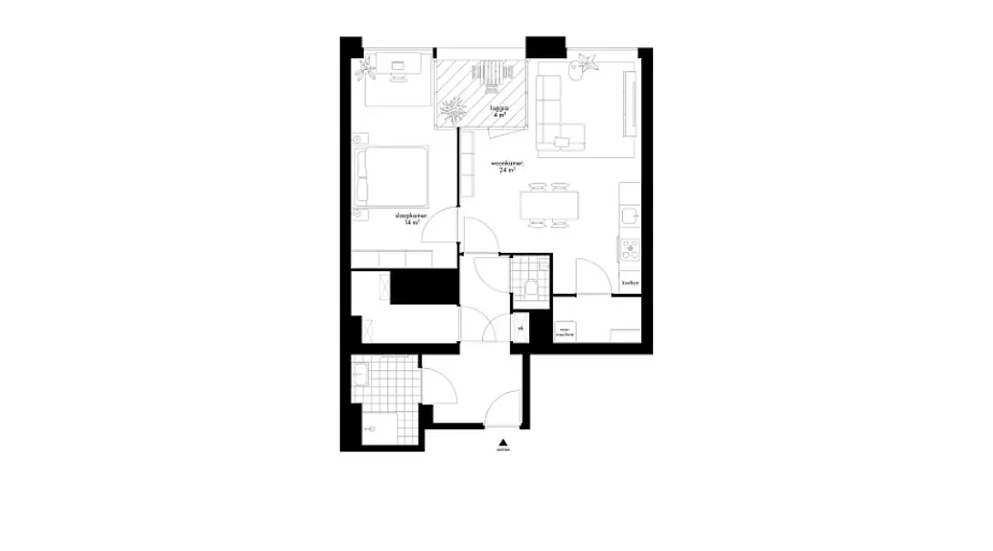 Dit ruime 2-kamerappartement ligt op de begane grond, 1e en 2e verdieping. Het appartement heeft een woonoppervlakte van ongeveer 62 m² en is ingedeeld met een living met open keuken, loggia, ruime slaapkamer, apart toilet en badkamer met wastafel en inloopdouche. Je hebt twee bergingen. In de berging aan de keuken kun je de wasmachine en wasdroger plaatsen en in de andere berging kun je spullen opbergen en staan de technische apparaten.