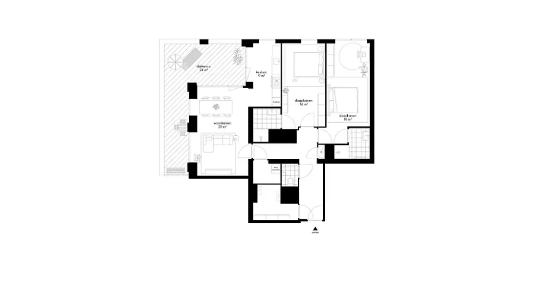Dit appartement ligt op de 23e verdieping en heeft een woonoppervlakte van ongeveer 95 m2. Het is een friendswoning, dus je huurt het appartement samen met familie, een collega of vriend. Samen deel je de royale living met open keuken en het dakterras van circa 24 m2 op het westen. En het toilet en de berging met de aansluitingen voor de wasmachine en wasdroger. Daarnaast heb je een eigen royale slaapkamer met ensuite badkamer die is ingedeeld met een wastafel en douche.