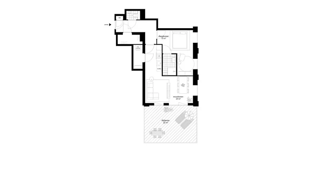 Dit 2-kamerappartement ligt op de 3e verdieping en heeft een woonoppervlakte van ongeveer 60 m². Het appartement is ingedeeld met een living met halfopen keuken, groot terras van 22 m2 op het zuidoosten en een slaapkamer met ensuite badkamer. De slaapkamer is ruim genoeg om bijvoorbeeld een werkhoek te creëren. Ideaal als je regelmatig thuis werkt! Je hebt twee bergingen. In de berging aan de keuken kun je de wasmachine en wasdroger plaatsen en in de andere berging kun je spullen opbergen en staan de technische apparaten.