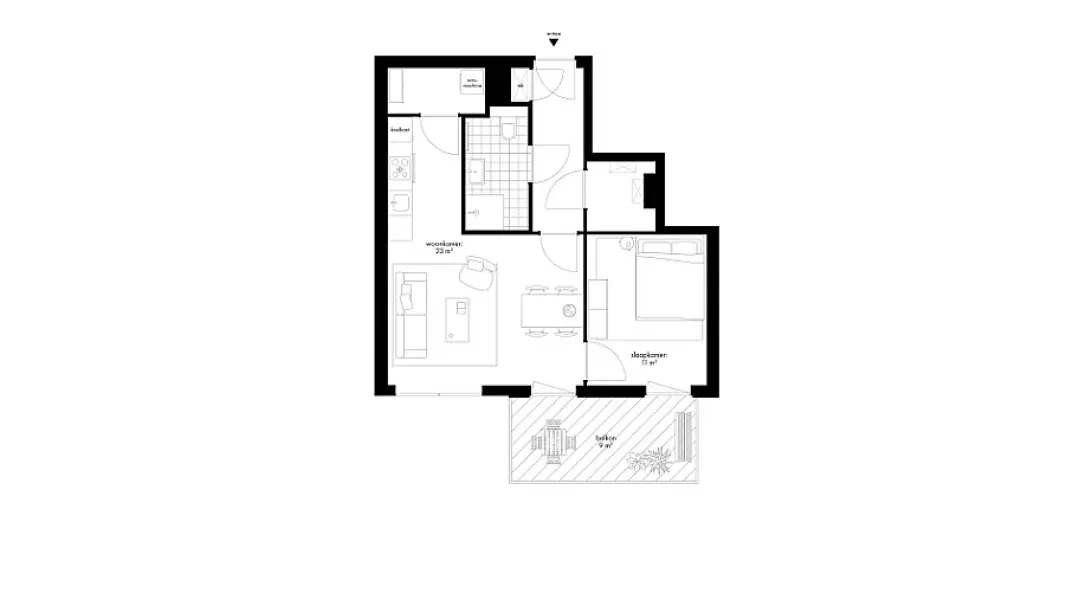 Dit 2-kamerappartement ligt op de 4e t/m 13e verdieping. Het royale balkon ligt op het zuidoosten. Het appartement heeft een woonoppervlakte van ongeveer 51 m² en is ingedeeld met een living met open keuken, ruime slaapkamer en badkamer met toilet, wastafel en inloopdouche. In de berging aan de keuken kun je de wasmachine en wasdroger plaatsen. De andere berging, aan de hal, biedt onder andere ruimte aan de technische apparaten.