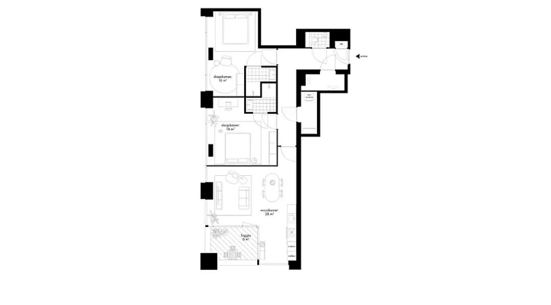 Het is een friendswoning, dus je huurt het appartement samen met familie, een collega of vriend. Samen deel je de royale living met open keuken en de loggia op het zuiden. En het toilet en de berging met de aansluitingen voor de wasmachine en wasdroger. Daarnaast heb je je eigen, royale slaapkamer met ensuite badkamer die is ingedeeld met een wastafel en douche.