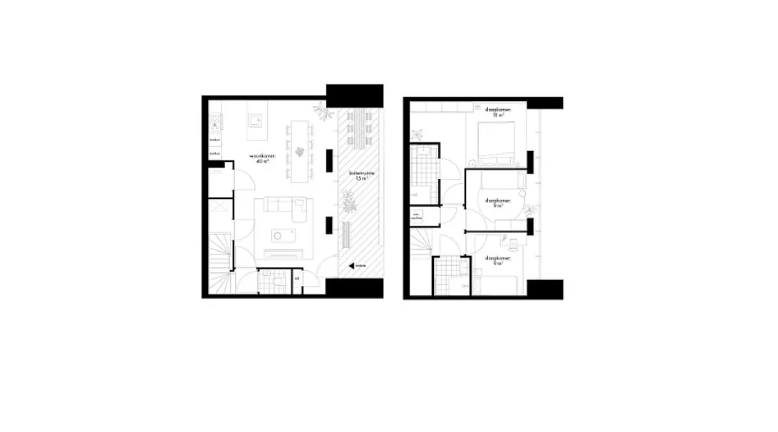 Deze 4-kamerwoning ligt op de begane grond. Het terras van circa 15 m² ligt over de volle breedte van de woning. De stadswoning heeft een oppervlakte van ongeveer 101 m² en is optimaal ingedeeld. Op de woonverdieping, aan het terras, liggen de living en open keuken met schiereiland. Boven heb je de luxe van drie slaapkamers en twee badkamers. De masterbedroom is uitgevoerd met een ensuite badkamer, de tweede badkamer is bereikbaar vanuit de hal. In de berging kun je een wasmachine en wasdroger op elkaar plaatsen.