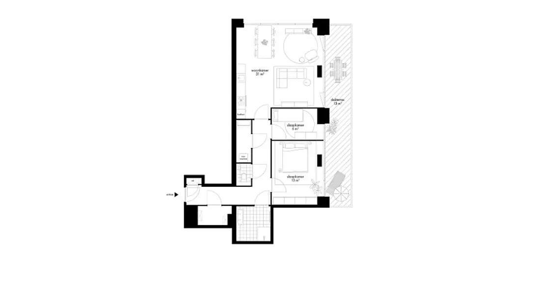 Dit 3-kamerappartement ligt op de 1e verdieping en heeft een woonoppervlakte van ongeveer 76 m². Het terras van circa 13 m² ligt over de volle breedte van het appartement. Vanwege de hoekligging heeft dit appartement extra ramen wat zorgt voor een mooie lichtinval. Het appartement is ingedeeld met een living met open keuken en twee slaapkamers. Aan de hal liggen het apart toilet, de badkamer en twee bergingen voor de wasmachine, wasdroger en de technische apparaten.