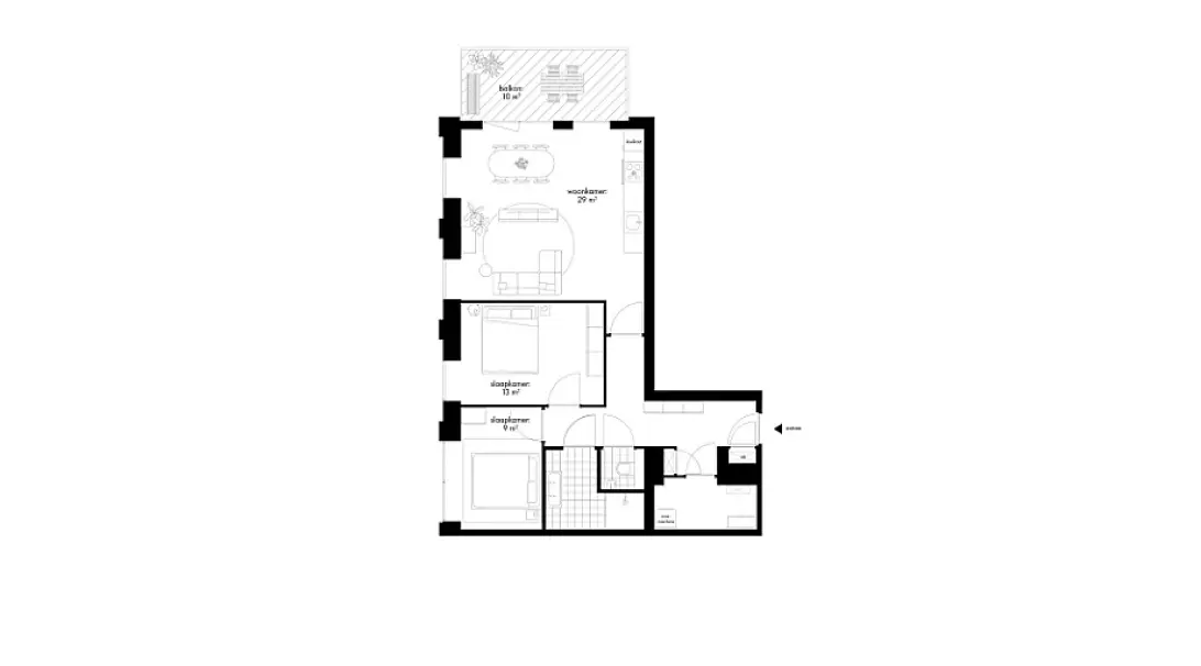 Dit 3-kamerappartement ligt op de 4e t/m 10e verdieping en heeft een woonoppervlakte van ongeveer 75 m². Vanwege de hoekligging heeft dit appartement extra ramen wat zorgt voor een mooie lichtinval. Het appartement is ingedeeld met een living met open keuken, balkon op het noordwesten en twee slaapkamers. Aan de hal liggen het apart toilet, de badkamer en de berging voor een wasmachine en wasdroger en de technische apparaten.