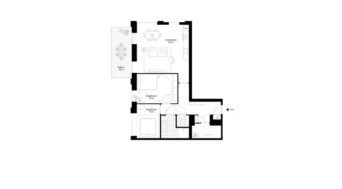 Dit 3-kamerappartement ligt op de 11e, 13e en 15e verdieping en heeft een woonoppervlakte van ongeveer 76 m². Het balkon heeft een ideale zonligging op het zuidwesten. Vanwege de hoekligging heeft dit appartement extra ramen wat zorgt voor een mooie lichtinval. Het appartement is ingedeeld met een living met open keuken en twee slaapkamers. Aan de hal liggen het apart toilet, de badkamer en de berging voor een wasmachine en wasdroger en de technische apparaten.