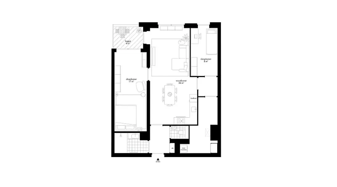 Dit 3-kamerappartement ligt op 1e verdieping en heeft een woonoppervlakte van ongeveer 74 m². Het appartement is ingedeeld met een ruime living met open hoekkeuken, twee slaapkamers, loggia, apart toilet, badkamer en een royale berging. In de berging kun je de wasmachine en wasdroger plaatsen en staan de technische apparaten. Bovendien kun je er nog van alles opbergen, zoals ski- en kerstspullen.