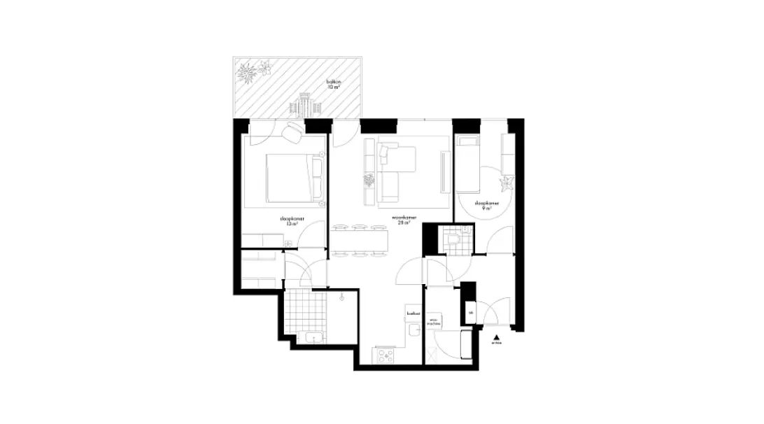Dit 3-kamerappartement ligt op 6e verdieping en heeft een woonoppervlakte van ongeveer 77 m². Bijzonder prettig is het balkon aan de living, met een zonligging op het noordwesten. Verder is het appartement ingedeeld met twee slaapkamers, een separaat toilet, badkamer en twee bergingen. In de ene berging kun je de wasmachine en de wasdroger plaatsen en staan de technische apparaten en in de andere berging kun je bijvoorbeeld extra kasten plaatsen, voor seizoenskleding en dergelijke.