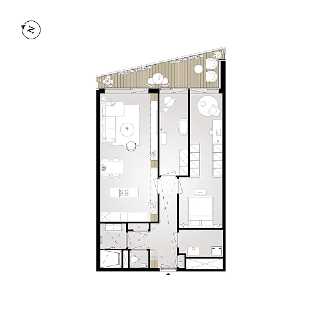Het appartement heeft een oppervlakte van ongeveer 82 m² en is ingedeeld met een living met open hoekkeuken, twee slaapkamers en een badkamer die vanuit de hal bereikbaar is. De masterbedroom is royaal en biedt de ruimte voor het creëren van een inloopkast of juist een hobby- of werkruimte. Bekijk de plattegrond en laat je inspireren!