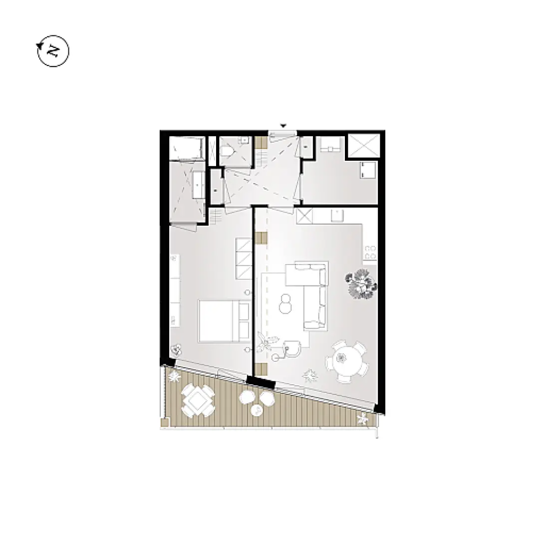 Het appartement heeft een oppervlakte van ongeveer 67 m² en is ingedeeld met een living met open hoekkeuken en een ruime slaapkamer met ensuite badkamer. In de berging heb je ruimte voor een wasmachine en wasdroger, kun je diverse spullen opbergen en staan de technische apparaten.