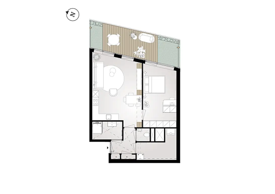 Het appartement heeft een oppervlakte van ongeveer 64 m² en is ingedeeld met een living met open hoekkeuken, een ruime slaapkamer waar je een inloopkast kunt creëren en een badkamer die vanuit de hal bereikbaar is. In de riante berging heb je ruimte voor een wasmachine en wasdroger, kun je diverse spullen opbergen en staan de technische apparaten.