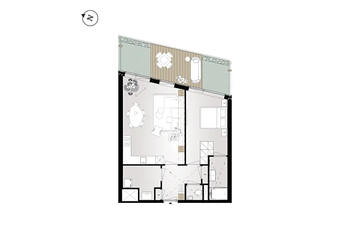 Het appartement heeft een oppervlakte van ongeveer 61 m² en is ingedeeld met een living met open hoekkeuken en een ruime slaapkamer met ensuite badkamer. In de berging heb je ruimte voor een wasmachine en wasdroger en staan de technische apparaten.