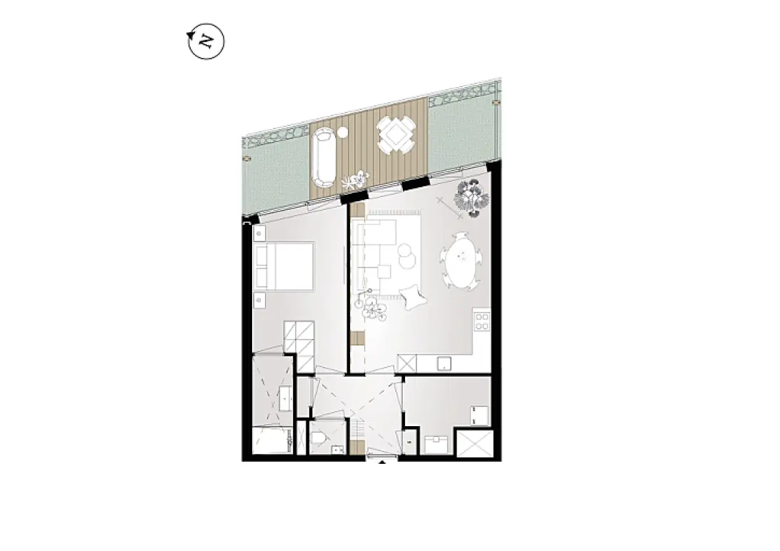 Het appartement heeft een oppervlakte van ongeveer 61 m² en is ingedeeld met een living met open hoekkeuken en een ruime slaapkamer met ensuite badkamer. In de berging heb je ruimte voor een wasmachine en wasdroger en staan de technische apparaten.