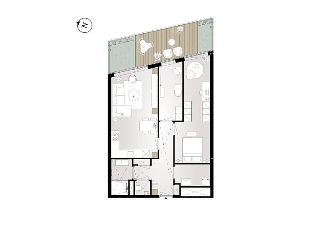 Het appartement heeft een oppervlakte van ongeveer 75 m² en is ingedeeld met een living met open hoekkeuken, twee slaapkamers en een badkamer die vanuit de hal bereikbaar is. De masterbedroom is royaal en biedt de ruimte voor het creëren van een inloopkast of juist een hobby- of werkruimte. Bekijk de plattegrond en laat je inspireren!