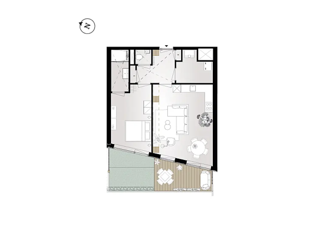 Het appartement heeft een oppervlakte van ongeveer 59 m² en is ingedeeld met een living met open hoekkeuken en een ruime slaapkamer met ensuite badkamer. In de riante berging heb je ruimte voor een wasmachine en wasdroger, kun je diverse spullen opbergen en staan de technische apparaten.