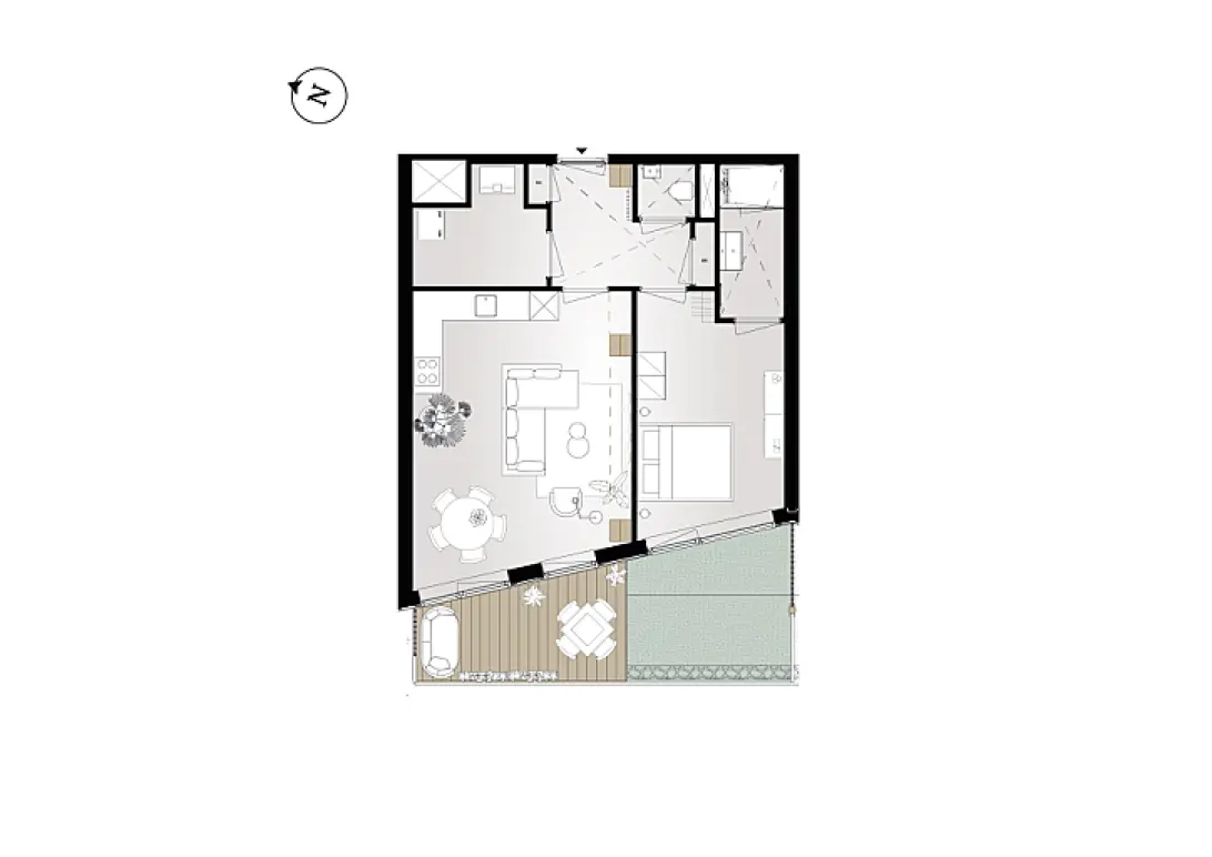 Het appartement heeft een oppervlakte van ongeveer 59 m² en is ingedeeld met een living met open hoekkeuken en een ruime slaapkamer met ensuite badkamer. In de riante berging heb je ruimte voor een wasmachine en wasdroger, kun je diverse spullen opbergen en staan de technische apparaten.