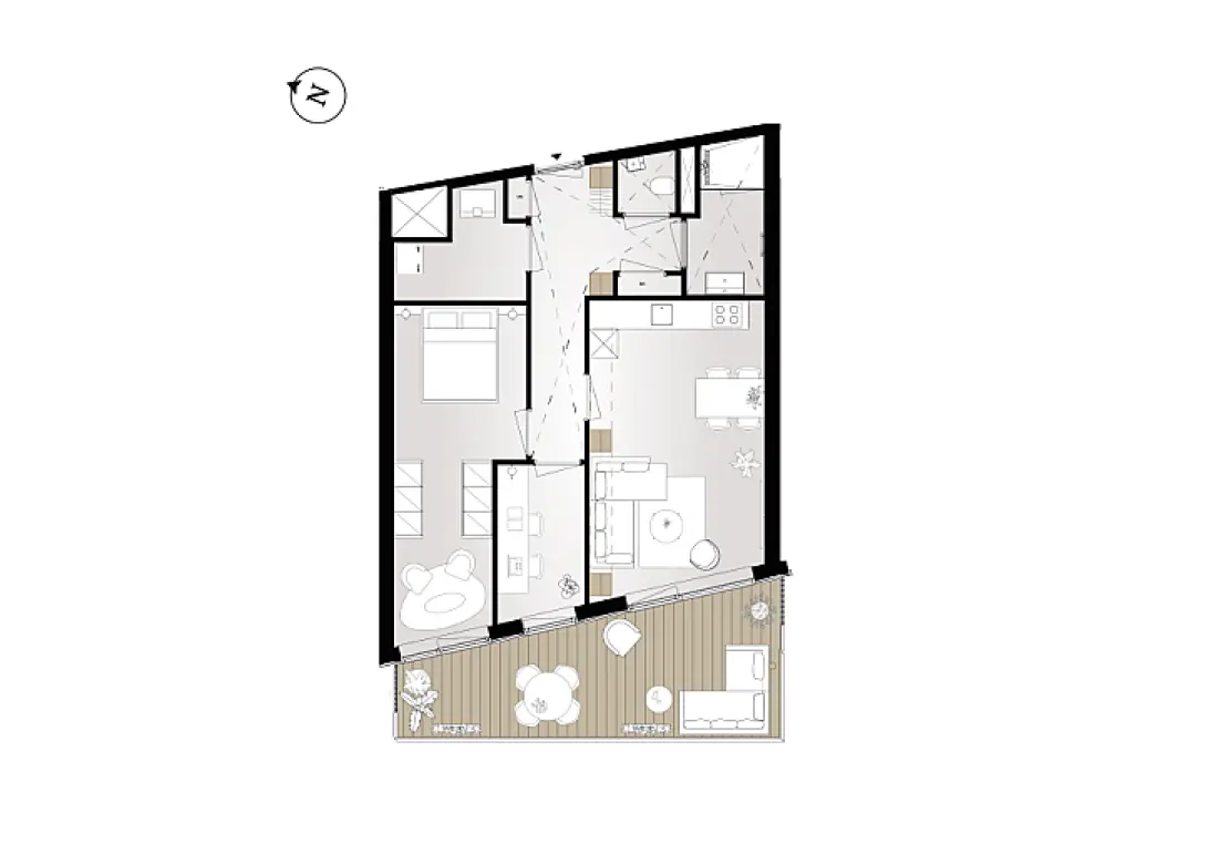 Het appartement heeft een oppervlakte van ongeveer 68 m² en is ingedeeld met een living met open keuken, twee slaapkamers en een badkamer die vanuit de hal bereikbaar is. De masterbedroom is royaal en biedt de ruimte voor het creëren van een inloopkast of juist een hobby- of werkruimte. Bekijk de plattegrond en laat je inspireren!