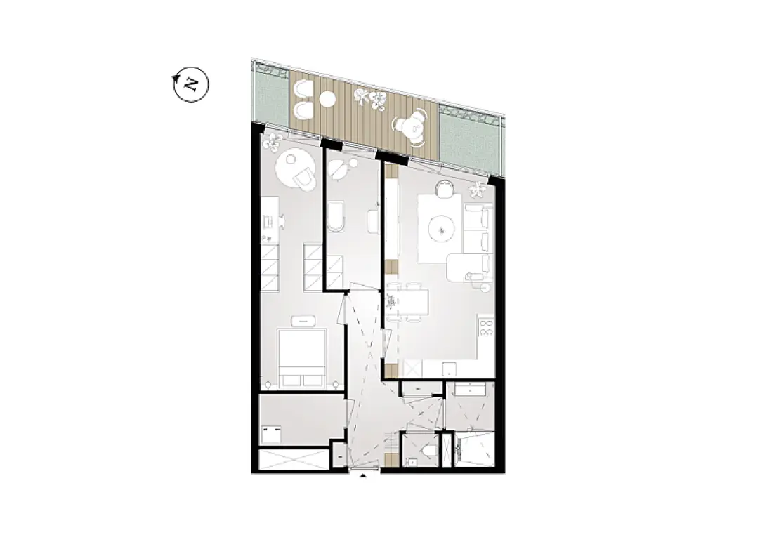 Het appartement heeft een oppervlakte van ongeveer 75 m² en is ingedeeld met een living met open hoekkeuken, twee slaapkamers en een badkamer die vanuit de hal bereikbaar is. De masterbedroom is royaal en biedt de ruimte voor het creëren van een inloopkast of juist een hobby- of werkruimte. Bekijk de plattegrond en laat je inspireren!