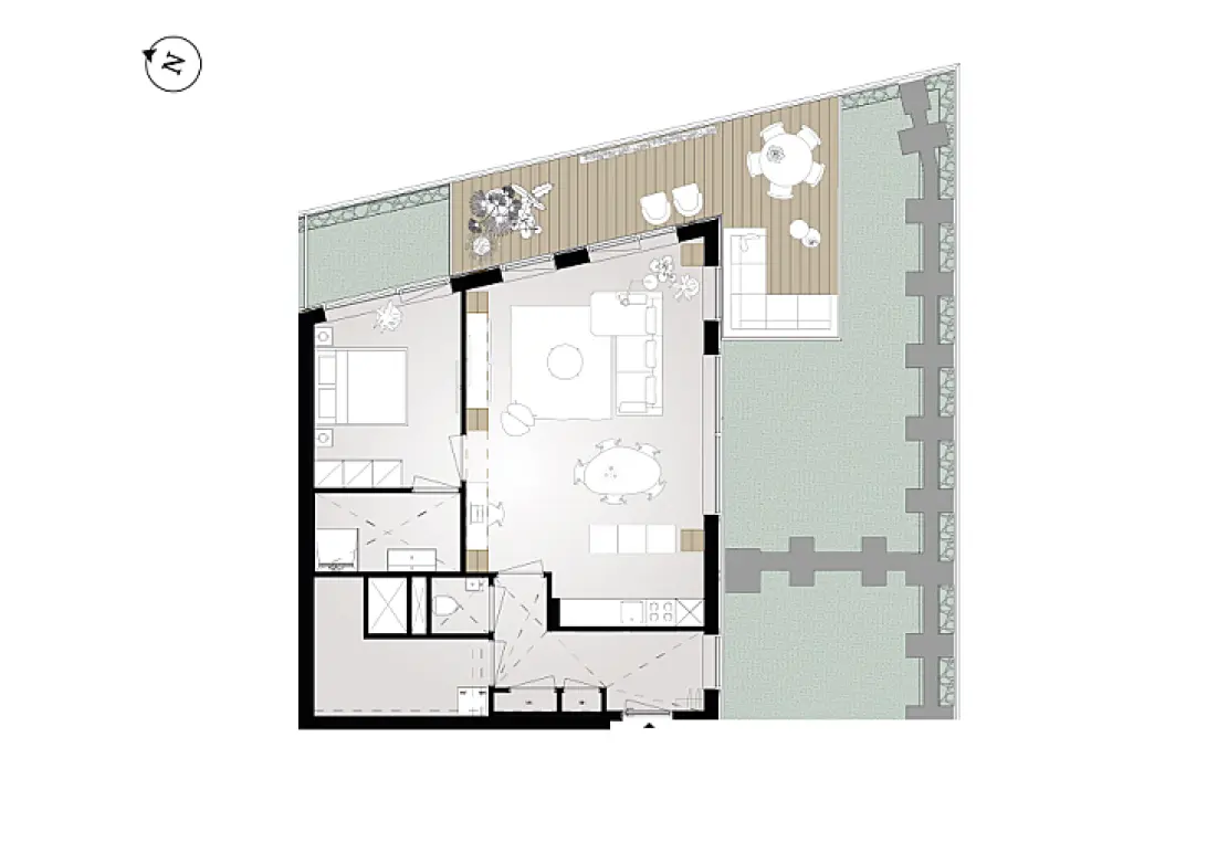 Dit 2-kamerappartement ligt op de 7e verdieping van The Ark en is een buitenkans als je een royale buitenruimte zoekt. Het balkon, van maar liefst 28 m2, ligt ideaal op het noodoosten en zuidoosten. Je geniet dus een groot deel van de dag van de zon! Bovendien geniet je van een geweldig uitzicht! Een deel van het balkon bestaat uit sedumbegroeiing, wat zorgt voor een fraaie, groene oase. De luchtkanalen die over de begroeiing lopen, worden modern uitgevoerd, in een passende kleur.