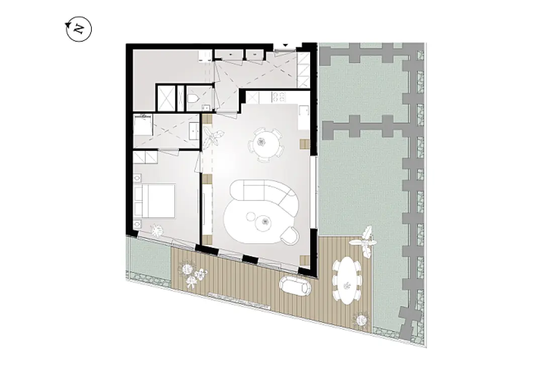Dit 2-kamerappartement ligt op de 7e verdieping van The Ark en is een buitenkans als je een royale buitenruimte zoekt, van zon houdt én een geweldig uitzicht wilt. Het balkon, van maar liefst 27 m2, ligt ideaal op het zuidoosten en zuidwesten. Een deel van het balkon bestaat uit sedumbegroeiing, wat zorgt voor een fraaie, groene oase. De luchtkanalen die over de begroeiing lopen, worden modern uitgevoerd, in een passende kleur.