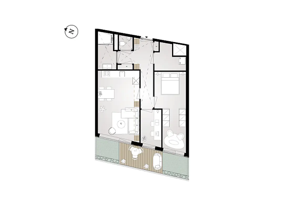 Het appartement heeft een oppervlakte van ongeveer 68 m² en is ingedeeld met een living met open keuken, twee slaapkamers en een badkamer die vanuit de hal bereikbaar is. De masterbedroom is royaal en biedt de ruimte voor het creëren van een inloopkast of juist een hobby- of werkruimte. Bekijk de plattegrond en laat je inspireren!