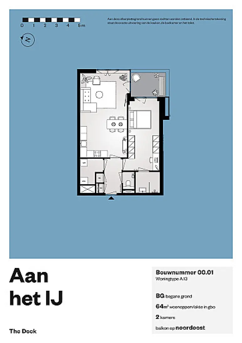 Het appartement heeft een oppervlakte van ongeveer 64 m² en is ingedeeld met een living met open hoekkeuken en een ruime slaapkamer met ensuite badkamer. In de berging heb je ruimte voor een wasmachine en wasdroger en staan de technische apparaten.