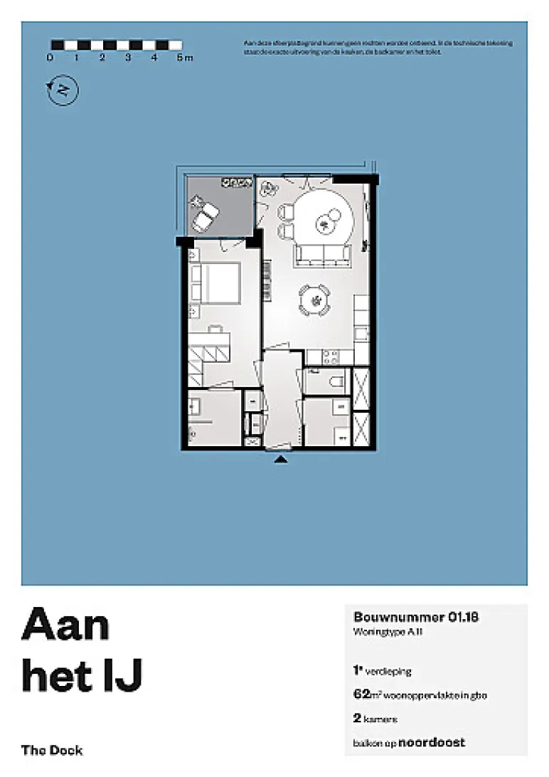 Het appartement heeft een oppervlakte van ongeveer 62 m² en is ingedeeld met een living met open hoekkeuken en een ruime slaapkamer met ensuite badkamer. In de berging heb je ruimte voor een wasmachine en wasdroger en staan de technische apparaten.