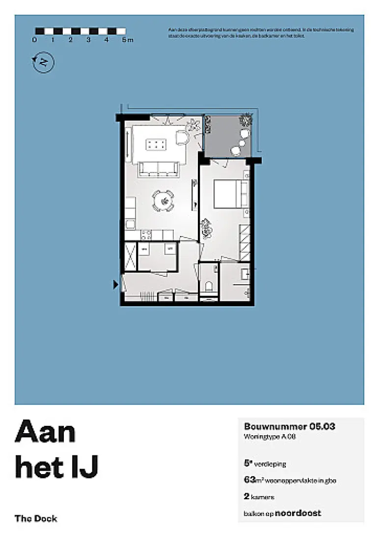 Het appartement heeft een oppervlakte van ongeveer 63 m² en is ingedeeld met een living met open hoekkeuken en een ruime slaapkamer met ensuite badkamer. In de berging heb je ruimte voor een wasmachine en wasdroger en staan de technische apparaten.