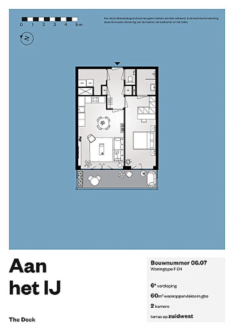 Dit 2-kamerappartement ligt op de 6e en 7e verdieping en beschikt over een breed terras. Het terras heeft een ideale zonligging op het zuidwesten. Vanuit de living en het terras heb je uitzicht op de nieuwe stadswijk Aan het IJ.
