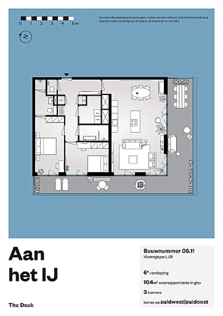 Het appartement heeft een oppervlakte van ongeveer 104 m² en is ingedeeld met een royale living met open eilandkeuken en twee riante slaapkamers. De masterbedroom heeft een ensuite badkamer met inloopdouche, brede wastafel én tweede toilet. De tweede badkamer is bereikbaar vanuit de hal. In de berging heb je ruimte voor een wasmachine en wasdroger en staan de technische apparaten.