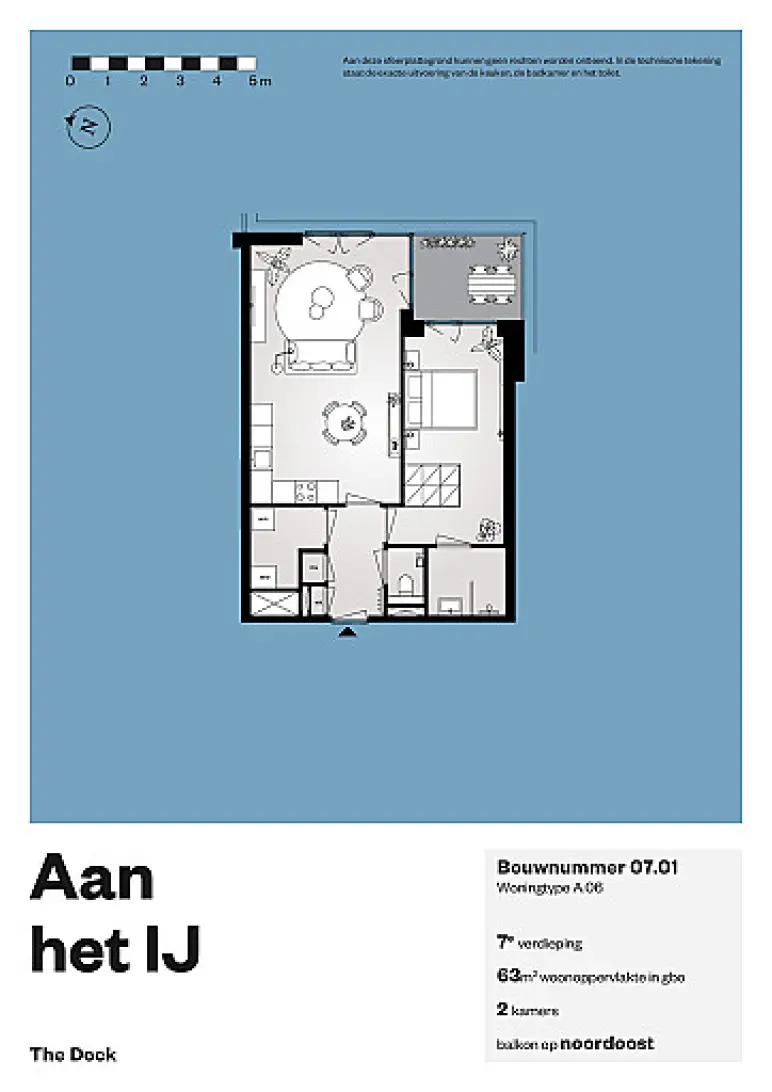 Het appartement heeft een oppervlakte van ongeveer 63 m² en is ingedeeld met een living met open hoekkeuken en een ruime slaapkamer met ensuite badkamer. In de berging heb je ruimte voor een wasmachine en wasdroger en staan de technische apparaten.