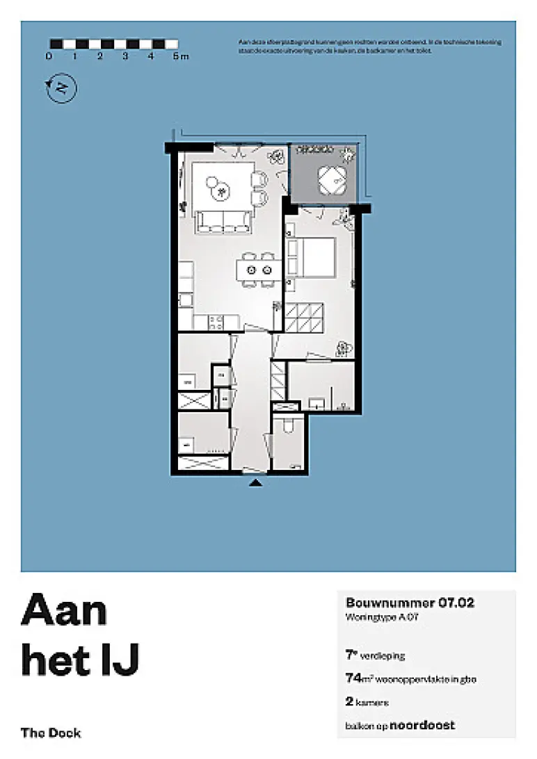 Het appartement heeft een oppervlakte van ongeveer 74 m² en is ingedeeld met een living met open hoekkeuken, een ruime slaapkamer met ensuite badkamer en twee bergingen. In de ene berging heb je ruimte voor een wasmachine en wasdroger en in de andere berging staan de technische apparaten.