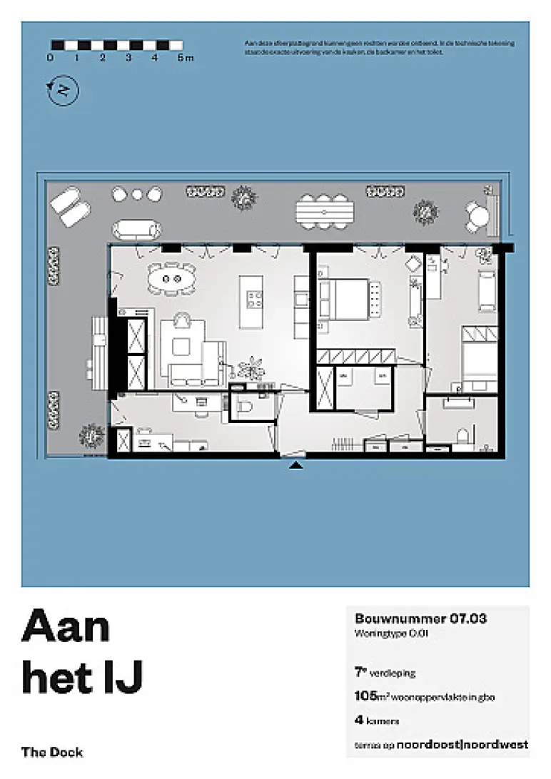 Het appartement heeft een oppervlakte van ongeveer 105 m² en is ingedeeld met een living met open eilandkeuken en drie slaapkamers. De derde slaapkamer kun je optioneel bij de living betrekken. In de berging heb je ruimte voor een wasmachine en wasdroger en staan de technische apparaten.