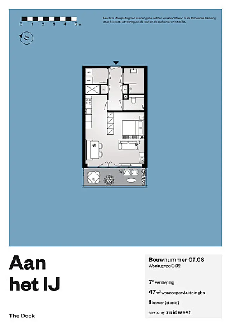 Deze studio ligt op de 6e en 7e verdieping en beschikt over een breed terras. Het terras heeft een ideale zonligging op het zuidwesten. Vanuit de living en het terras heb je uitzicht op de nieuwe stadswijk Aan het IJ.