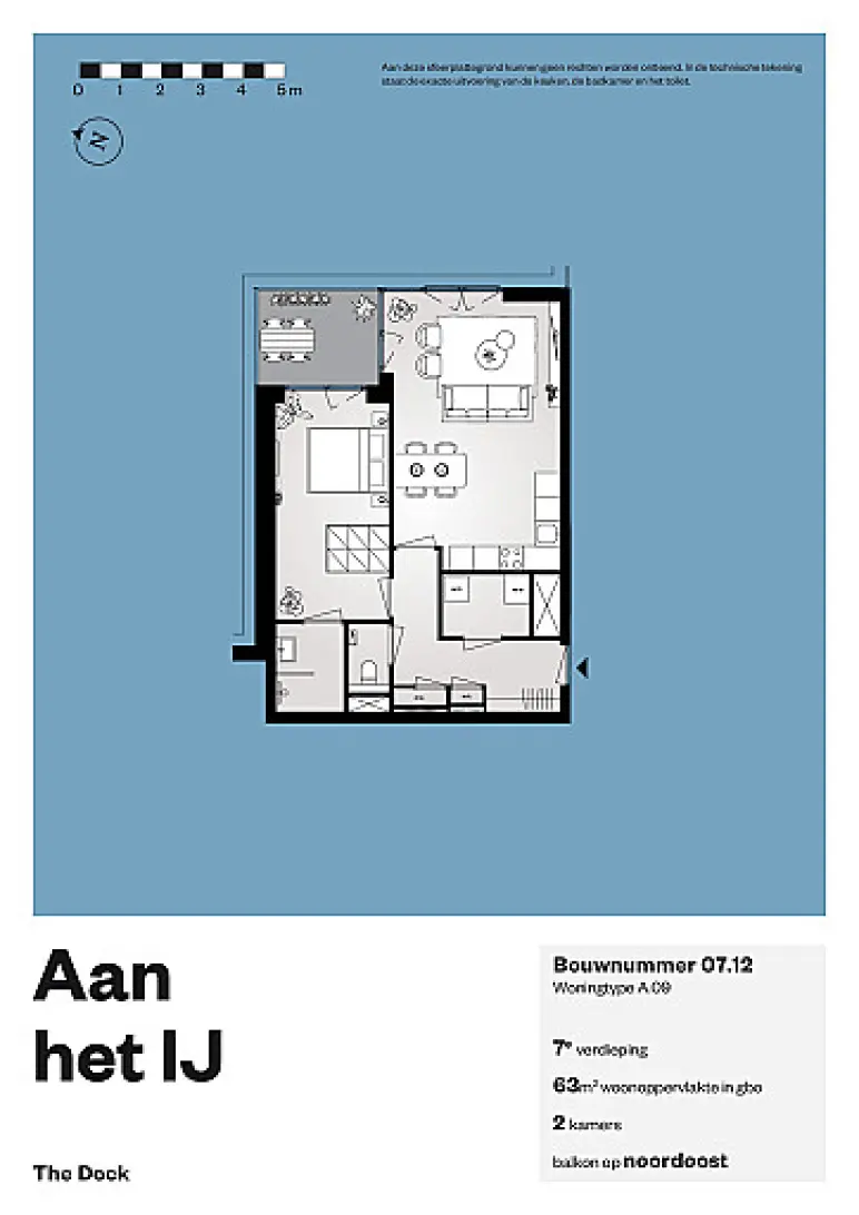 Het appartement heeft een oppervlakte van ongeveer 63 m² en is ingedeeld met een living met open hoekkeuken en een ruime slaapkamer met ensuite badkamer. In de berging heb je ruimte voor een wasmachine en wasdroger en staan de technische apparaten.