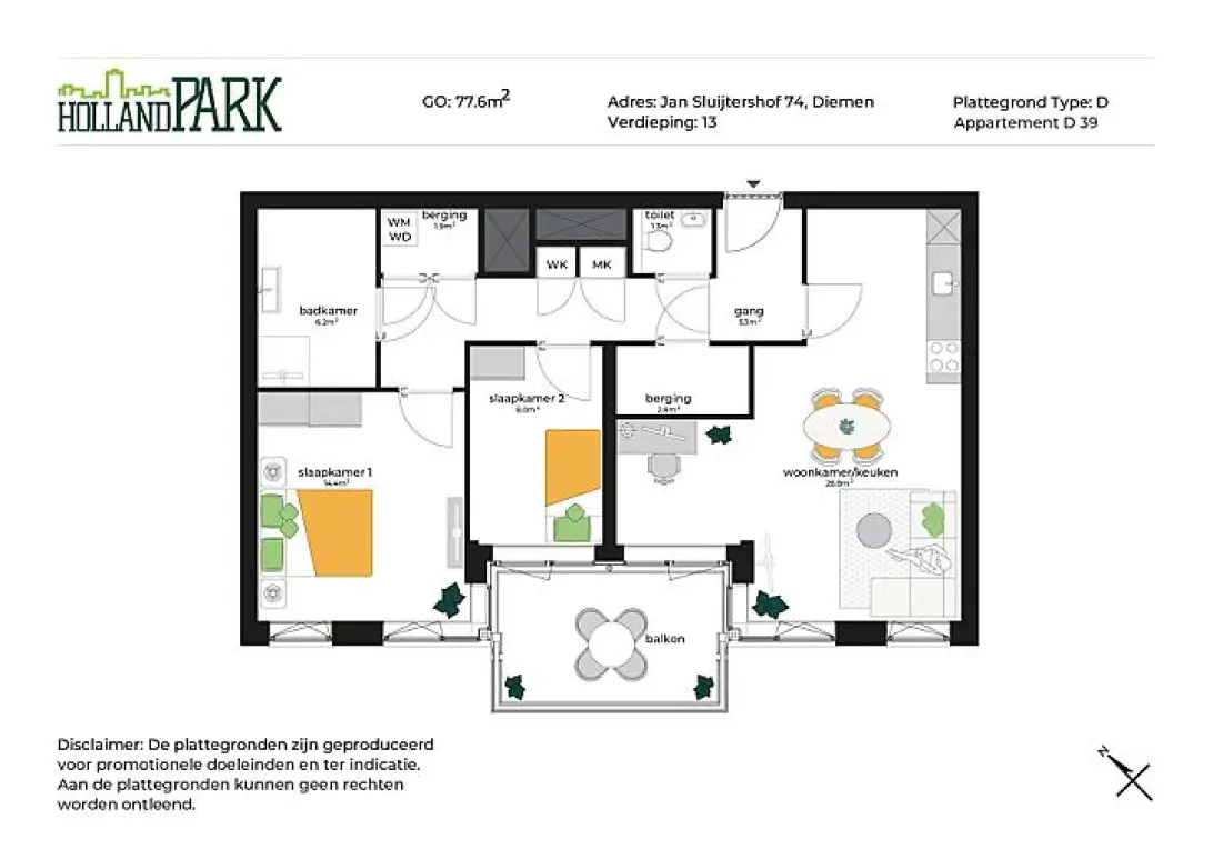Op de tweede tot en met de dertiende verdieping gelegen, biedt dit 77 m² grote appartement een perfecte combinatie van stijl en comfort. De woonkamer met open keuken van 28 m² komt uit op een balkon, ideaal om te kunnen ontspannen. Er zijn twee slaapkamers die beide uitkijken op het balkon, een moderne badkamer, en een berging voor opslag. De gang verbindt alle kamers, waaronder het separate toilet, wat zorgt voor een overzichtelijke en prettige leefruimte.