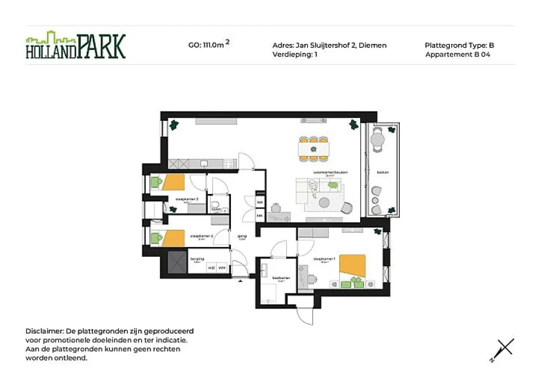 Met een woonoppervlakte van 111 m² is dit appartement een oase van ruimte en licht. De open woonkamer en keuken beslaan samen 50 m² en openen naar een groot balkon over de hele breedte van de woonkamer. Het appartement beschikt over drie slaapkamers, een badkamer, een aparte berging, separaat toilet en een praktische gang. De indeling is perfect voor een gezin dat houdt van ruimte en comfort.