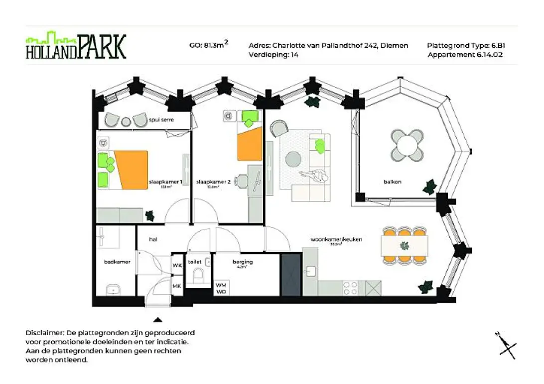 Gelegen op de veertiende verdieping, biedt dit lichte appartement van 81m² een schitterend uitzicht. De woonkamer met open keuken van 35m² leidt naar het ruime balkon, ideaal om van de buitenlucht te genieten. Het appartement heeft twee slaapkamers (beide 13m²), een moderne badkamer, een apart toilet en een praktische berging. De hal zorgt voor een logische verbinding tussen alle ruimtes, waardoor het appartement ruimtelijk en functioneel aanvoelt.
