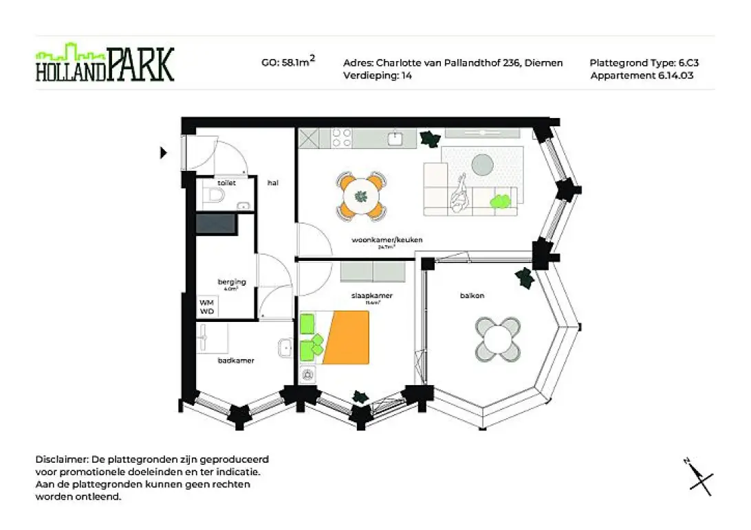 Op de veertiende verdieping biedt dit appartement van 58m² een indrukwekkend uitzicht. De gezellige woonkamer met open keuken van 24m² loopt uit op een ruim balkon, ideaal voor het genieten van mooie dagen. Het appartement heeft een comfortabele slaapkamer van 11m², een moderne badkamer, een apart toilet en een berging. De hal zorgt voor een logische indeling, waardoor het appartement ruimtelijk en functioneel aanvoelt.
