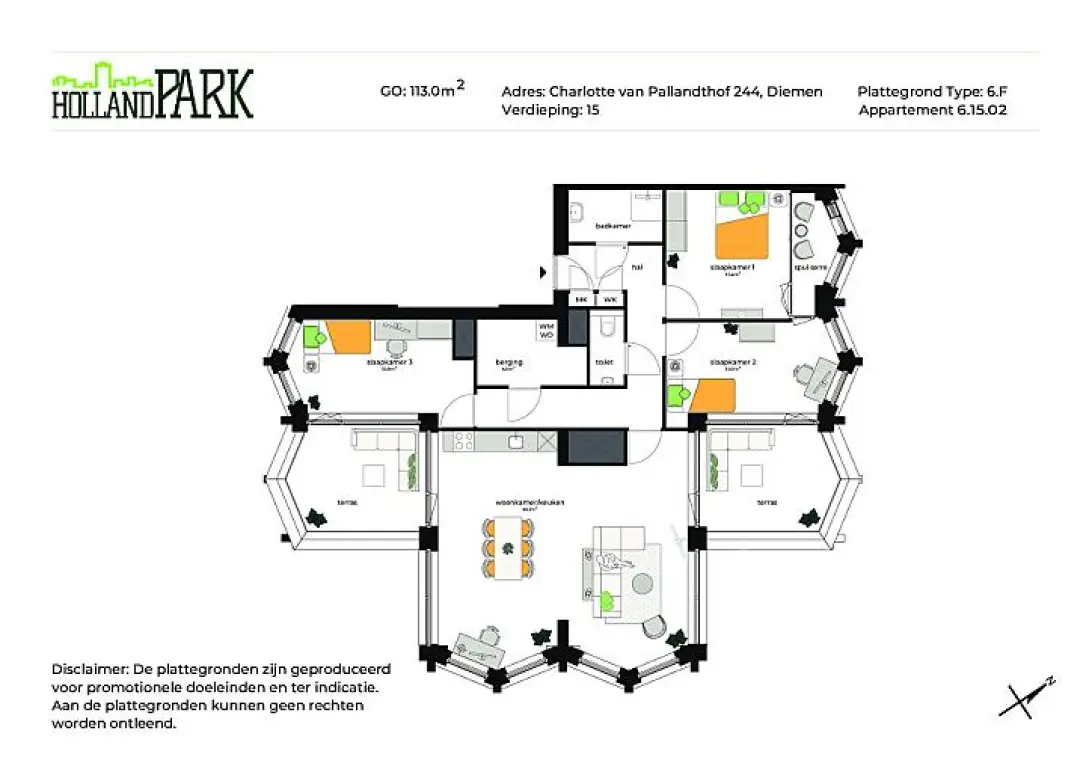 Op de vijftiende verdieping biedt dit ruime appartement van 113m² een indrukwekkend uitzicht en een fijne leefomgeving. De ruime woonkamer met open keuken van 45m² geeft toegang tot twee terrassen aan beide kanten, perfect voor buitenleven. Het appartement beschikt over drie ruime slaapkamers (13m², 13m² en 13m²), een moderne badkamer, een apart toilet en een handige berging. De hal zorgt voor een logische en praktische verbinding tussen alle kamers.