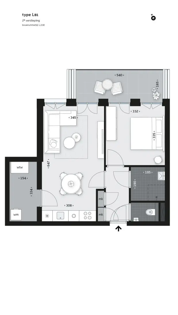 Apartment types Lb and Lc are ideally laid out and beautifully located on the green courtyard garden. The layout of the living room of Lc is similar to the living room of type Lb. Type Lb has no windows in the side elevation. Another difference concerns outdoor space. Lb1 and Lc1 have a large terrace facing the communal and very green courtyard garden. Lb2 and Lc2 have a balcony overlooking this communal garden.